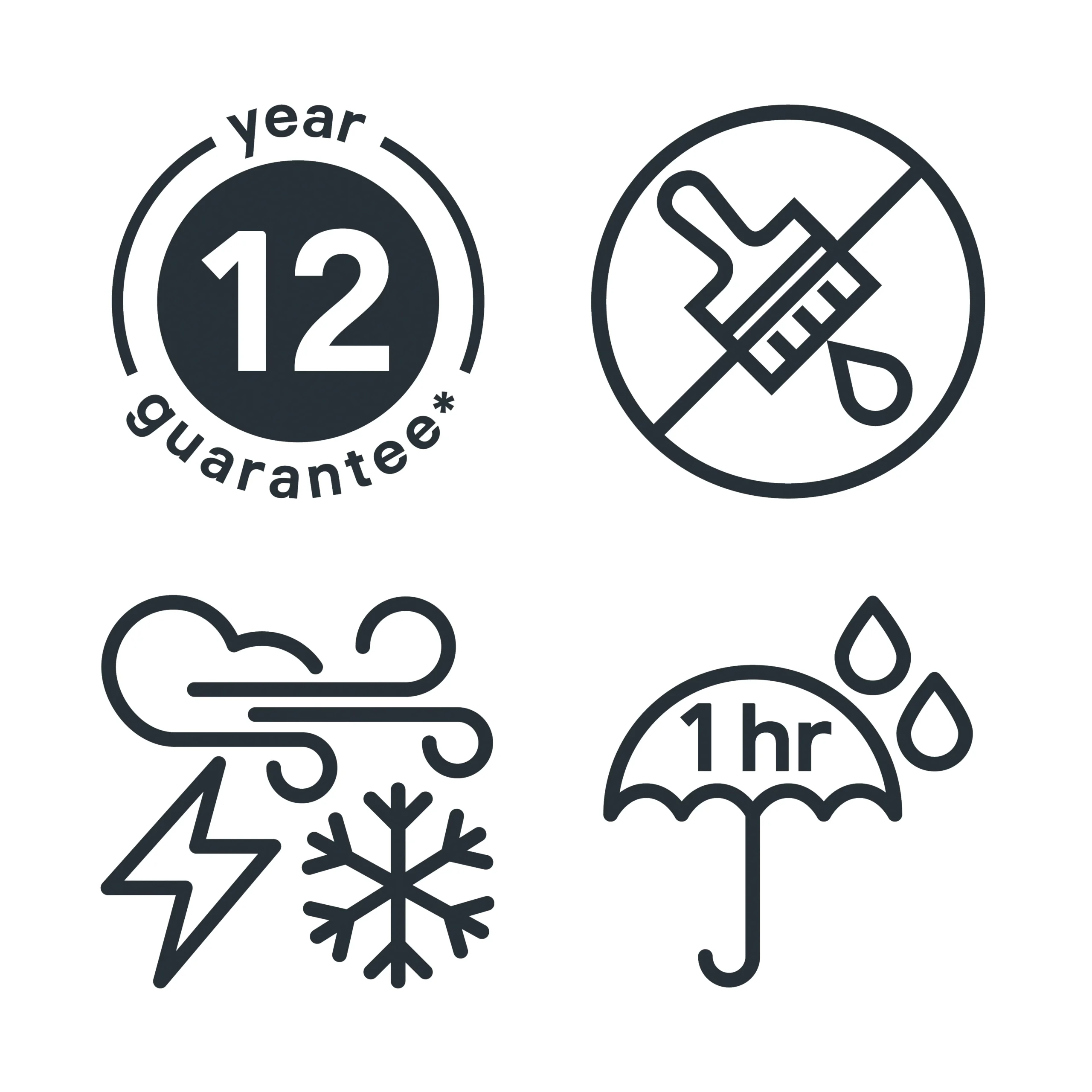 - Weather-resistant, Resistant to ultraviolet