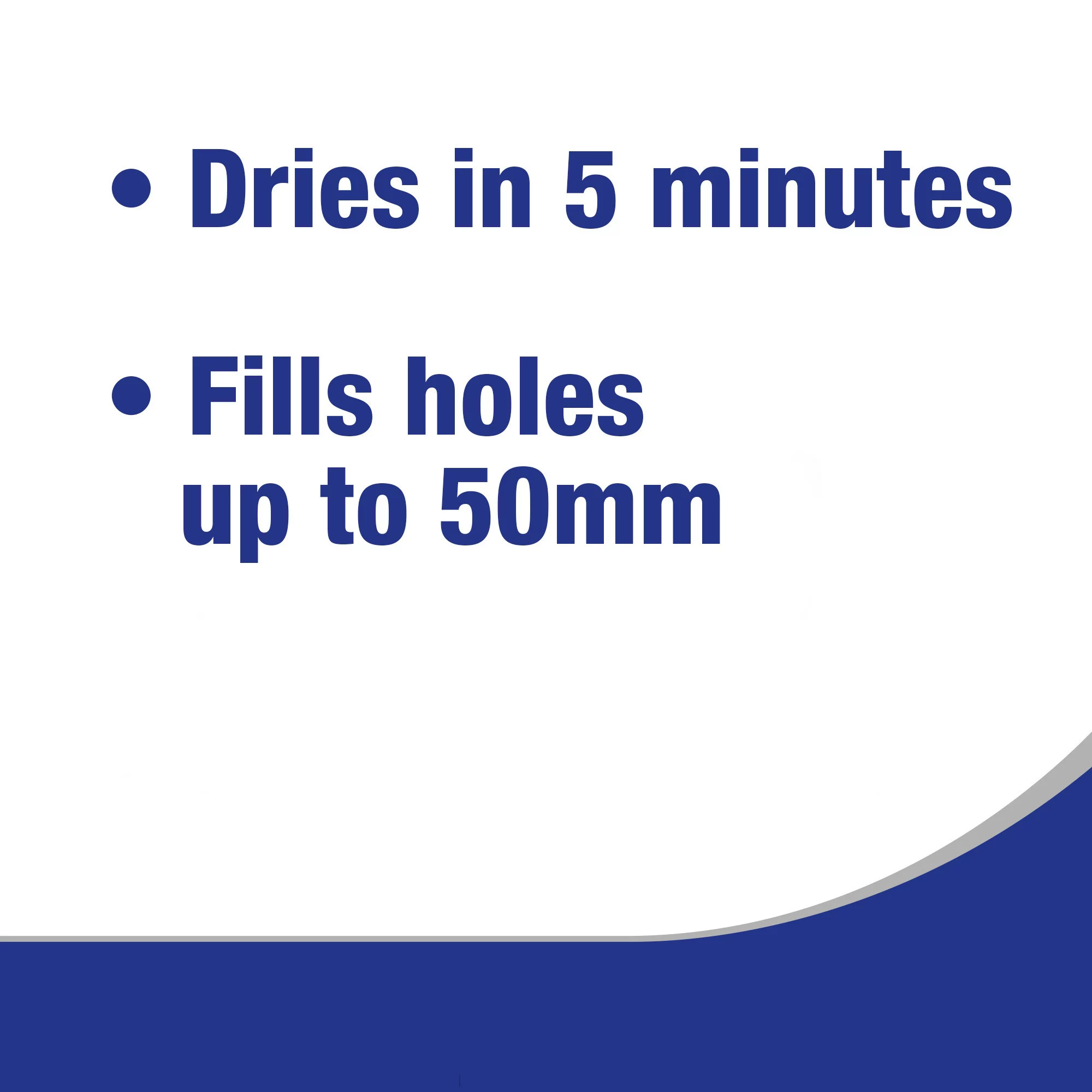 - The formulation will not shrink or sag and has been specially formulated to allow the filling of holes up to 50mm in one go